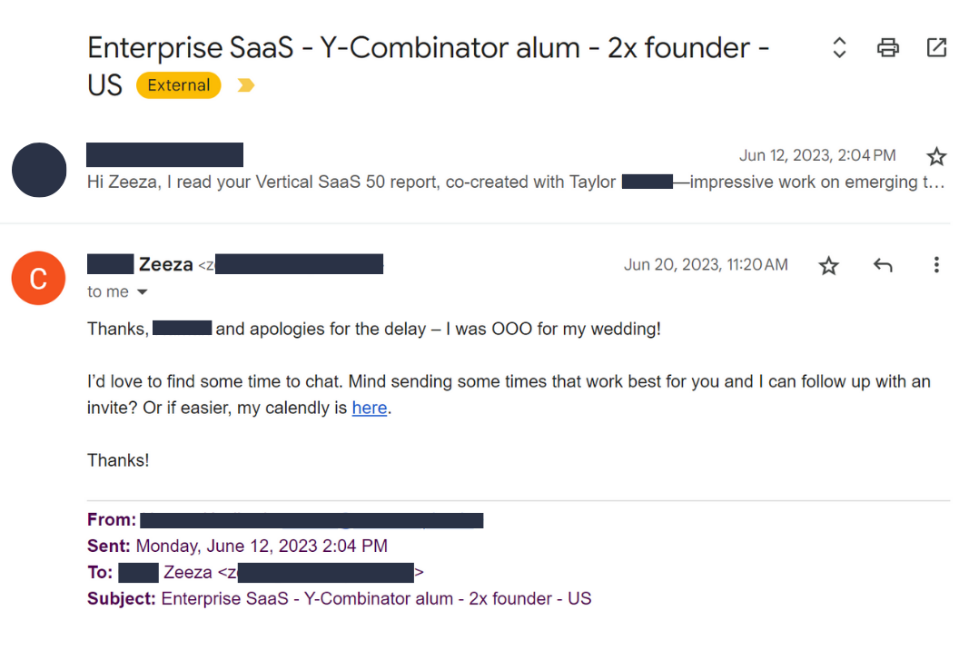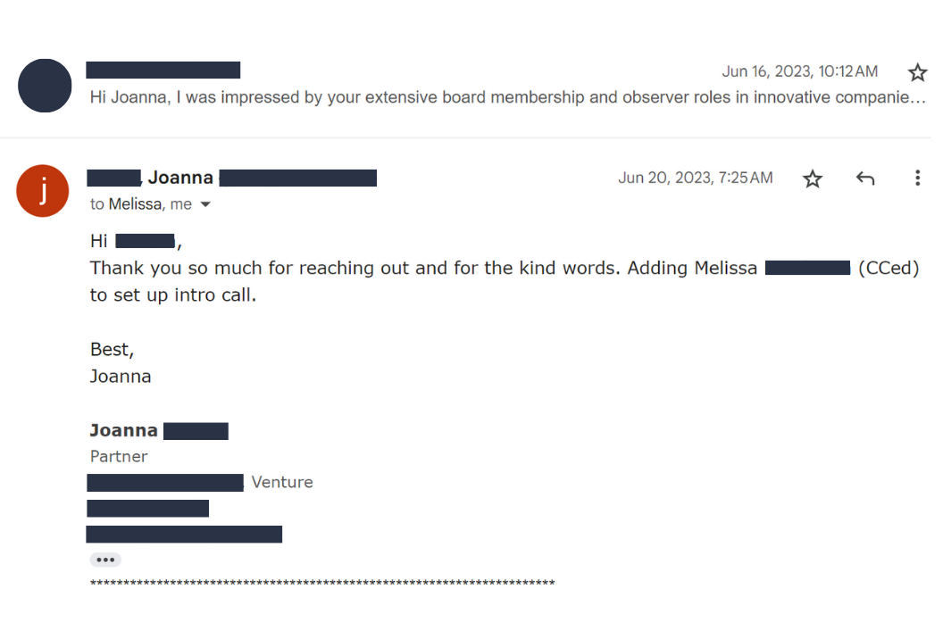 Tailor each message to an investor's interests, portfolio, and activity to secure more meetings and close your round faster.